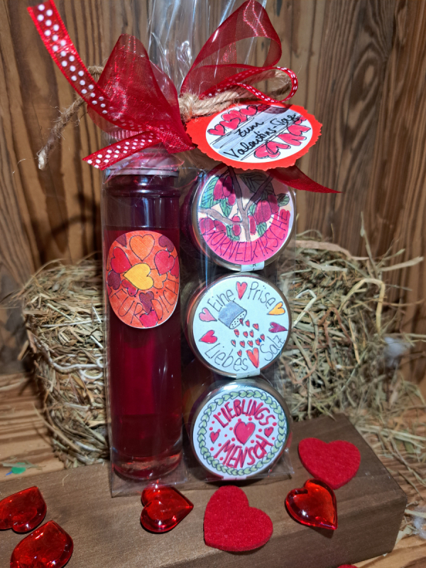 Ein PIMP YOUT PROSECCO um auf die Liebe anzustoßen, zwei Minimarmeladen für die süße Liebe und ein Kräutersalz, weil die Liebe ist ja bekanntlich das Salz in der Suppe!