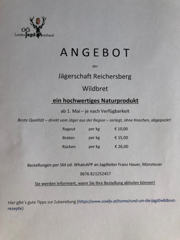 Wir bitten um Direktbestellung beim Jagdleiter Franz Hauer: 0676/821 252 457
