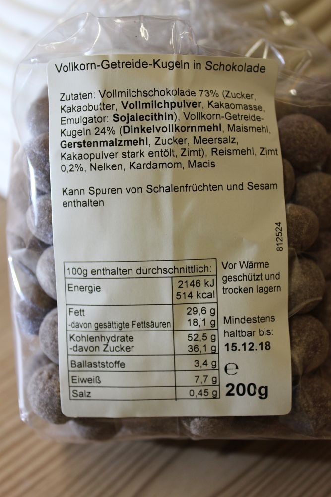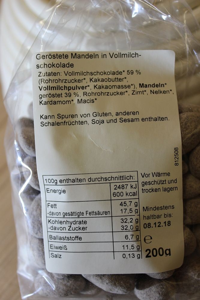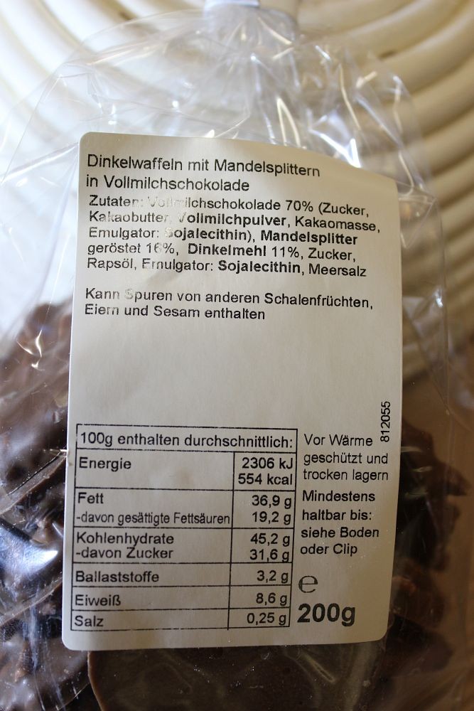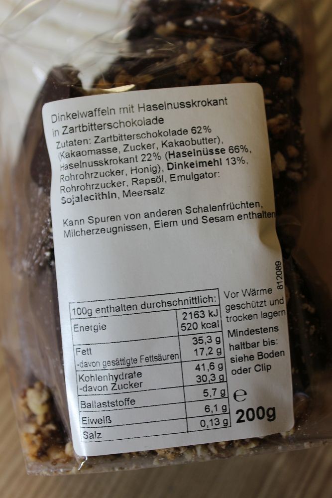 Zutaten: Vollmilchschokolade 35% (Zucker, Kakaobutter, Vollmilchpulver, Kakaomasse, Emulgator: Sojalecithin), Dinkelmehl 32%, Rohrohrzucker, Butter, Marzipan (Mandeln, Zucker, Wasser, Invertzuckersirup), Honig, Meersalz, Backtriebmittel: Hirschhornsalz und Natriumhydrogencarbonat( Natron), Vollmilchpulver, Säuerungsmittel: Monokaliumtartrat (Reinweinstein), Maisstärke,
